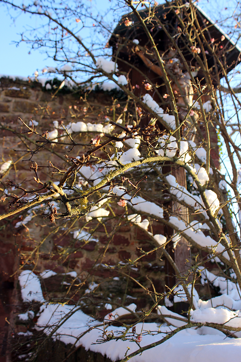 Die rosa Blüten des sog. „Winter-Schneeballs“, die immer in der Weihnachtszeit (oder zuweilen sogar noch früher) erscheinen und uns auf der Gamburg im tiefsten Winter einen Hauch von Frühling und Ostern bescheren.