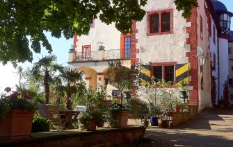 Blütenpracht und Sitznische an der Mauer der Burgterrasse