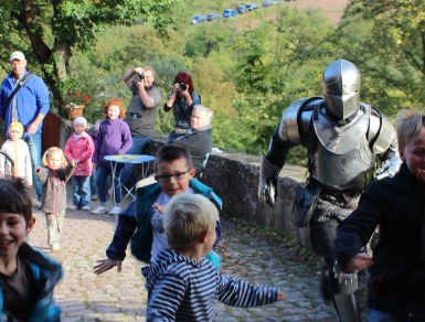 Am Sonntag dann taucht die Gamburg noch weit tiefer in die Vergangenheit ein und bietet ein spannendes Programm für Jung und Alt. Mit Pfeil-, Schwert und Lanzenspitzen testen die Besucher ihr Können und streben nach der Ritterwürde. Die Teilnehmer müssen dabei in Wettkämpfen gewisse Herausforderungen bestehen wie etwa Ringstechen, Armbrust- oder Bogenschießen, aber auch dichten, Kräuter finden, ihr Familienwappen entwerfen und ihre höfische Bildung und Erziehung unter Beweis stellen. Dabei lernen Sie auch viel über die Welt der Ritter, etwa über historisches Fechten oder die Kunst eines Sarwürkers, welche vor Ort demonstriert wird. Währenddessen gibt der Burgbarde zu diesen ritterlichen Spielen den Takt an. Am Ende der Übung in ritterlichen Tugenden steht der feierliche Ritterschlag.